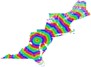 The above images were calculated with road network data for the USA northeast coast. On the first (left) image we see Maine, Cape Cod, Long Island, and down to and including Virginia. At this resolution the colorful roads tend to fill in all intervening space. The second image is a "blow up" near and around York Pennsylvania; you can make out the Susquehanna River. In this second image you can make out lots of road structure in the intervening space, and so this second image has a higher pixel per road length resolution than the first image.