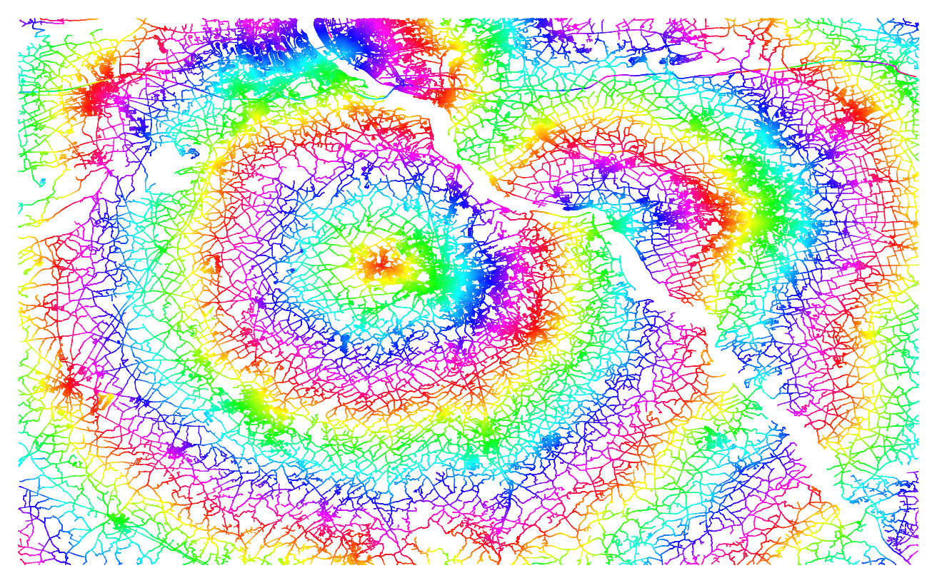 Scalar field plots of drive time from (or to) a "source" point. The color changes continuously with drive time in a repeating rainbow pattern. Note that rings of constant color are rings of constant drive time to (or from) the source point. Roads squiggle, and therefore, so do the rings of constant drive time. Varying speed limits add additional ring distortions as do rivers, bridges, traffic signals and signs.